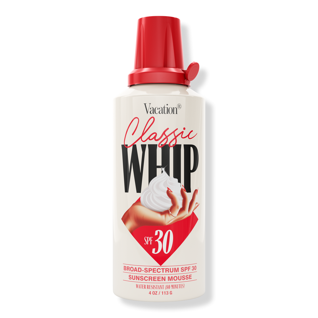 Vacation Classic Whip SPF 30 Sunscreen Mousse is a "lighter-than-air" sunscreen featuring an authentic "tilt valve" actuator that produces perfect, star-shaped mountains of foam inspired by everyone's favorite after dinner indulgence