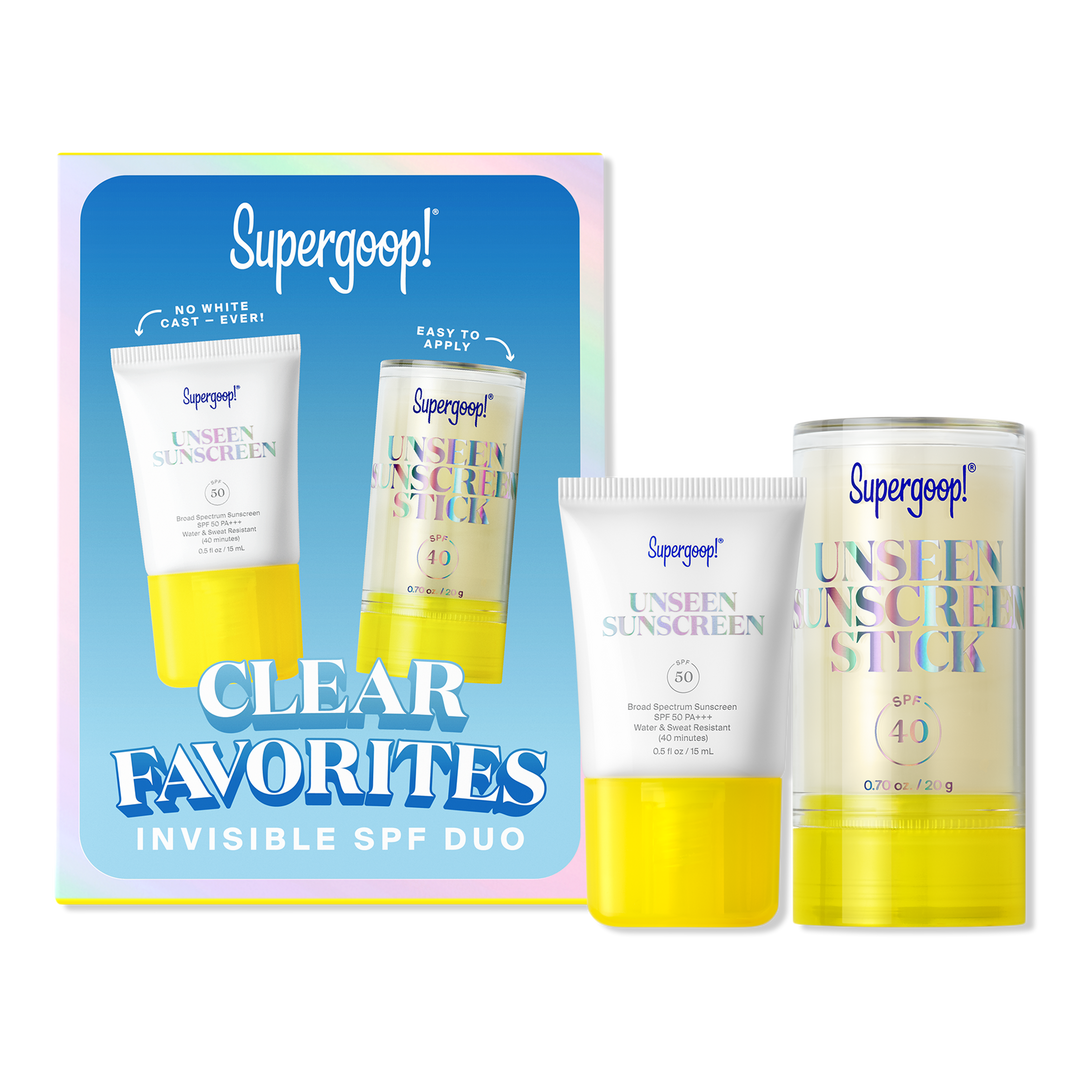 Supergoop! Clear Favorites Invisible SPF Duo includes two 100% invisible SPF essentials for daily sun protection with no white cast.