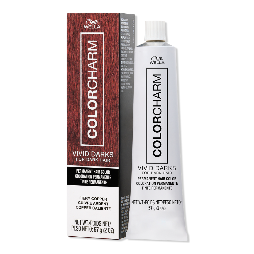 Wella Colorcharm Vivid Darks Permanent Cream Color achieves vibrant color on naturally dark hair. This permanent dye lifts color up to 3-4 levels, no bleach needed, and helps combat damage with a built-in metal purifier.