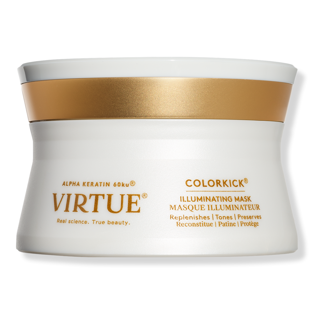 Virtue ColorKick Illuminating Mask For All Shades protects and maintains hair color between services by providing intense hydration, reflective luminosity, and color vibrancy, as well as solar and heat protection to keep shades from dulling and drying out.