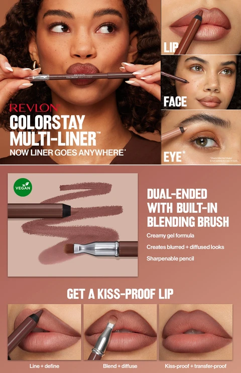 Revlon ColorStay Multi-Liner is multi-use for lip, face and eye* that contours, blends, freckles, highlights, lines, defines and fills. Easy-glide formula + built-in blending brush.