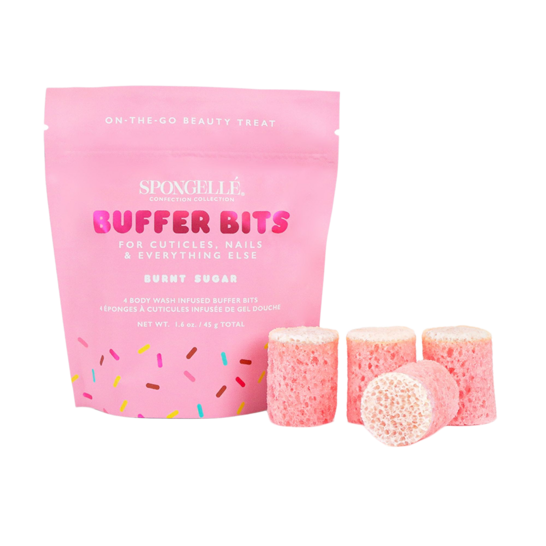 Inspired by tiny donut holes, Mini Buffer Bits in Burnt Sugar gently exfoliate nails, cuticles & dry patches. Dual-sided and infused with triple butter & sugarcane extract, they leave a sweet scent of strawberry blossom, pink sugar & vanilla.