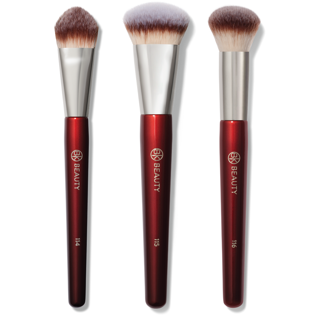 Three essential face brushes — 114 Dual-Sided Concealer, 115 Medium Contoured Foundation and 116 Small Round Complexion — for seamless liquid, cream and powder application to conceal, build coverage and contour.