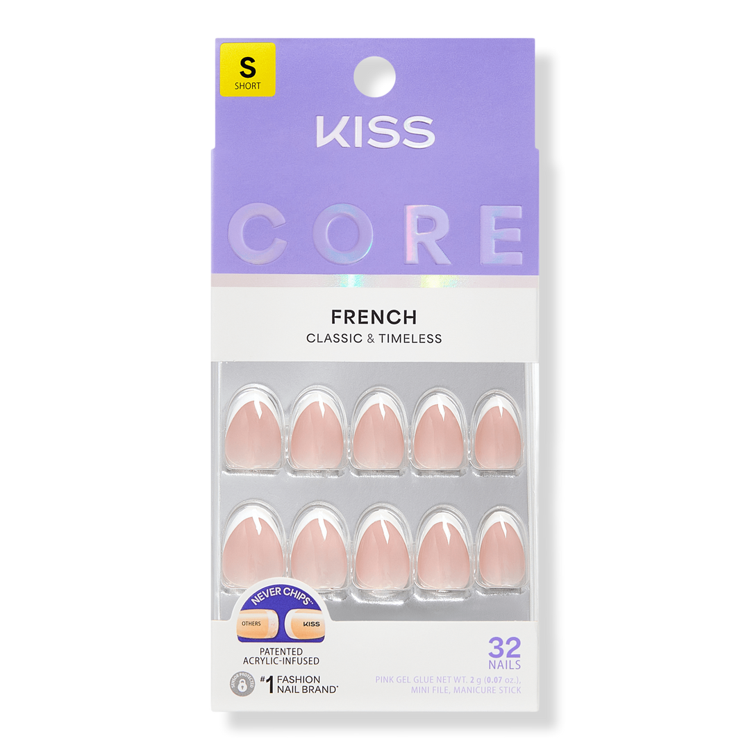 NEW Look. MORE Nails. BETTER Fit! Keep it classic in KISS CORE French Press On Nails. These nails feature chip-free, acrylic-infused technology that ensures long-lasting color and durable wear. These nails provide timeless French tips in natural shapes and lengths, perfect for every day.
