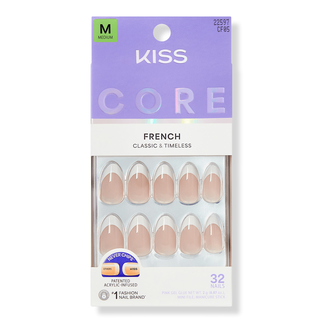 NEW Look. MORE Nails. BETTER Fit! Keep it classic in KISS CORE French Press On Nails. These nails feature chip-free, acrylic-infused technology that ensures long-lasting color and durable wear. These nails provide timeless French tips in natural shapes and lengths, perfect for every day.