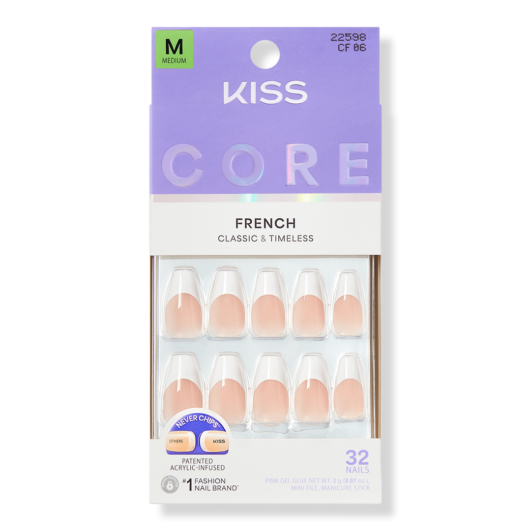 NEW Look. MORE Nails. BETTER Fit! Keep it classic in KISS CORE French Press On Nails. These nails feature chip-free, acrylic-infused technology that ensures long-lasting color and durable wear. These nails provide timeless French tips in natural shapes and lengths, perfect for every day.