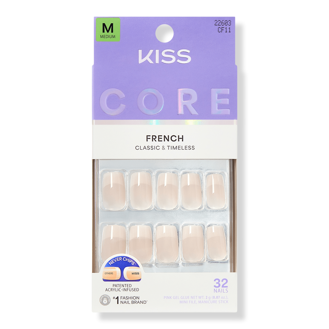 NEW Look. MORE Nails. BETTER Fit! Keep it classic in KISS CORE French Press On Nails. These nails feature chip-free, acrylic-infused technology that ensures long-lasting color and durable wear. These nails provide timeless French tips in natural shapes and lengths, perfect for every day.