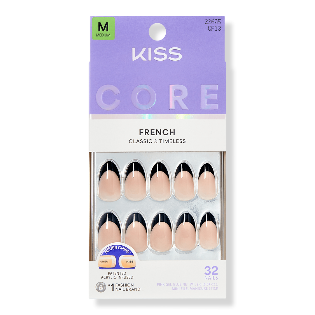 NEW Look. MORE Nails. BETTER Fit! Keep it classic in KISS CORE French Press On Nails. These nails feature chip-free, acrylic-infused technology that ensures long-lasting color and durable wear. These nails provide timeless French tips in natural shapes and lengths, perfect for every day.