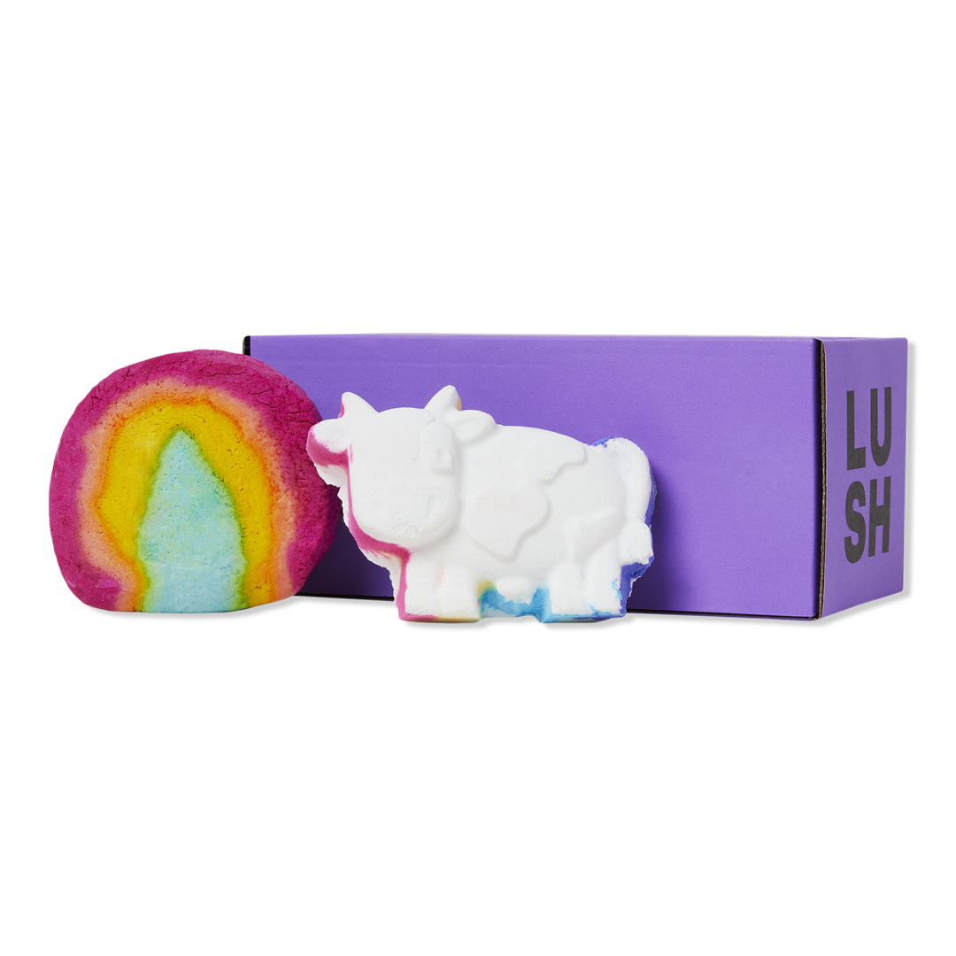 Two joyfully colorful baths await with waves of rainbow fizz and bubbles galore, can be found in Lush's The Cow Jumped Over The Rainbow Bathing Duo.