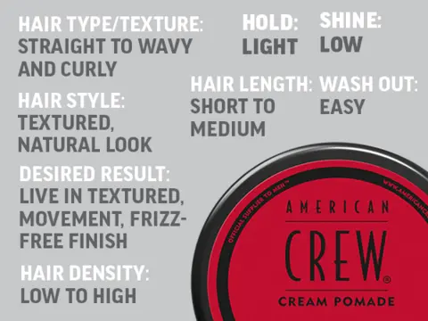 American Crew Pomade is a moisture-rich cream pomade that provides a natural look while taming hair leaving a low shine finish.