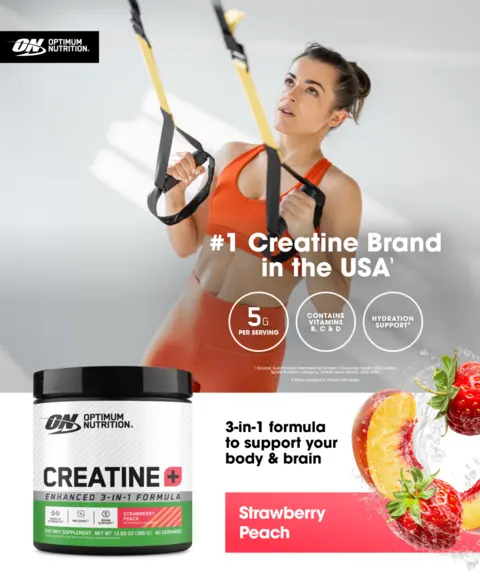 Optimum Nutrition Creatine [+] powder mix supports muscle strength and recovery with 5g of creatine monohydrate per serving and delivers antioxidant, brain, bone and cellular energy support with vitamins B, C, and D. Packed with 370mg electrolyte blend to replace what’s lost through sweat.