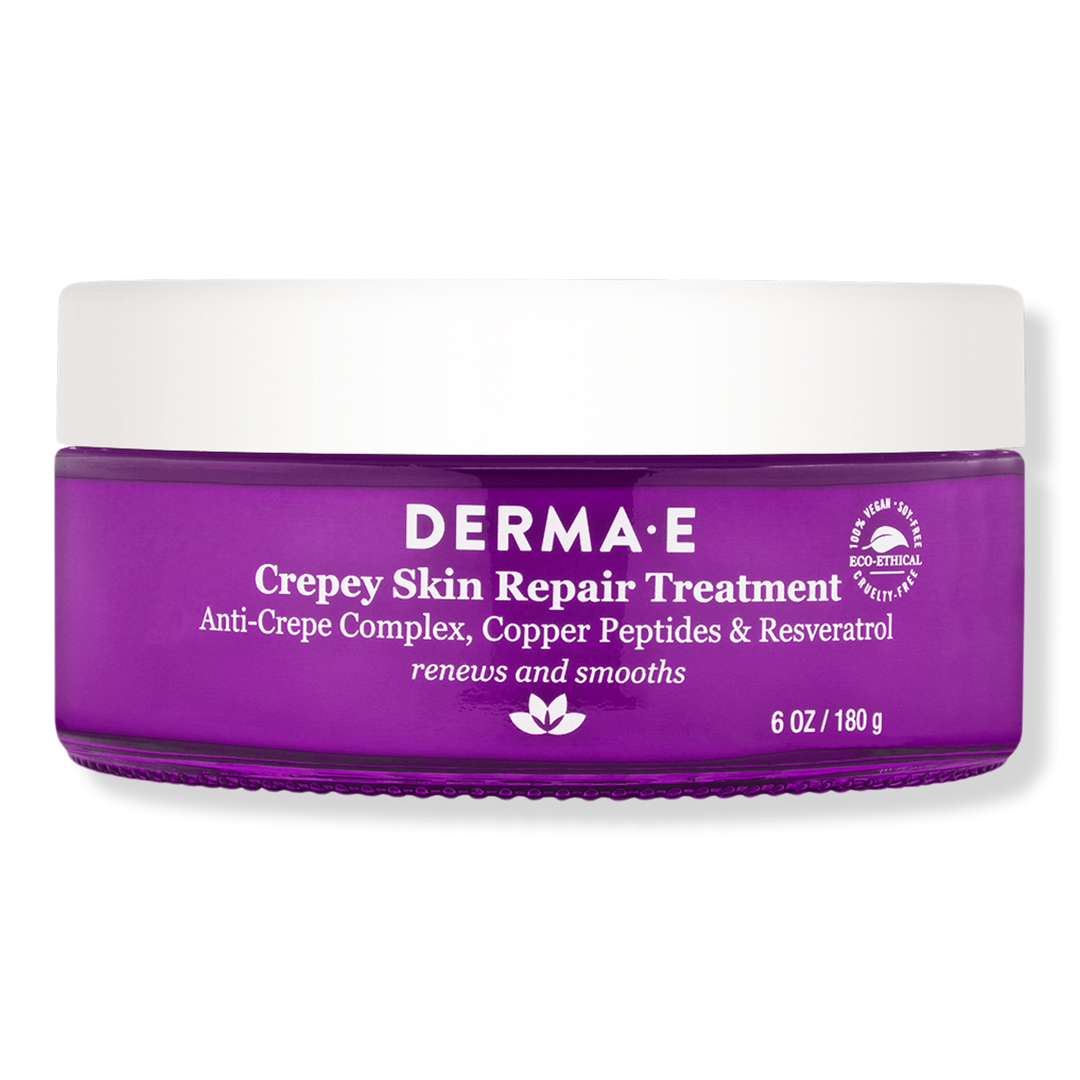 Derma E's Crepey Skin Repair Treatment with Resveratrol is a highly-efficacious restorative cream addresses dry, crepey skin, transforming it to visibly smoother, hydrated and firmer skin.