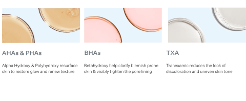 - Exfoliating acids (alpha hydroxy and polyhydroxy) brighten and refine texture