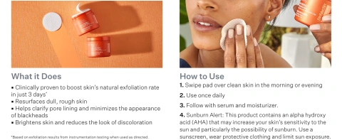 Use once daily. Swipe pad over clean skin in the morning or evening. Follow with serum and moisturizer.