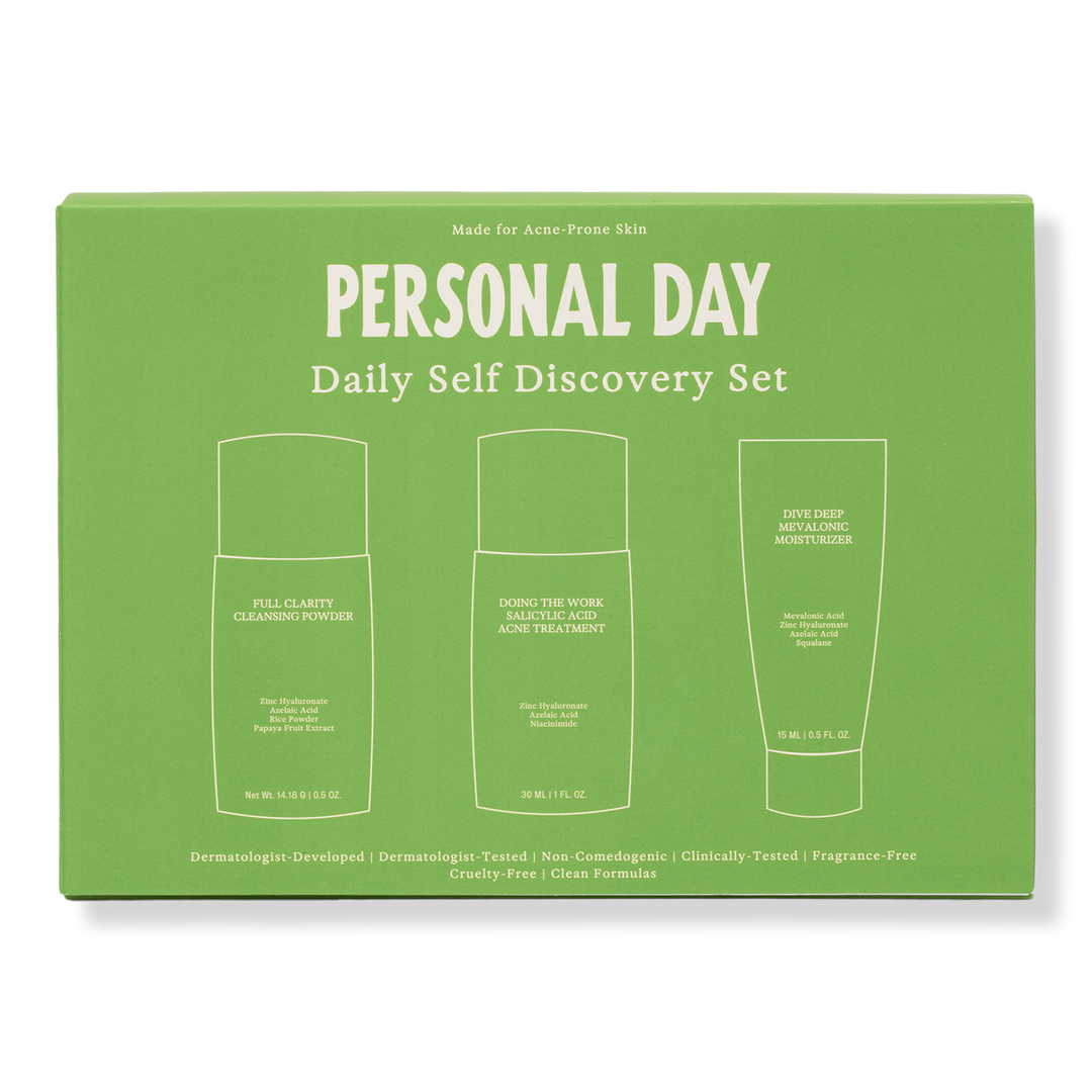 Skincare doesn’t have to be complicated. Personal Day Daily Self-Discovery Set is a no-fuss, trial-sized, 3-step routine for clearer skin. Start with the Full Clarity Cleansing Powder, then apply Doing the Work Salicylic Acid Acne Treatment, and finish with the Dive Deep Mevalonic Moisturizer.