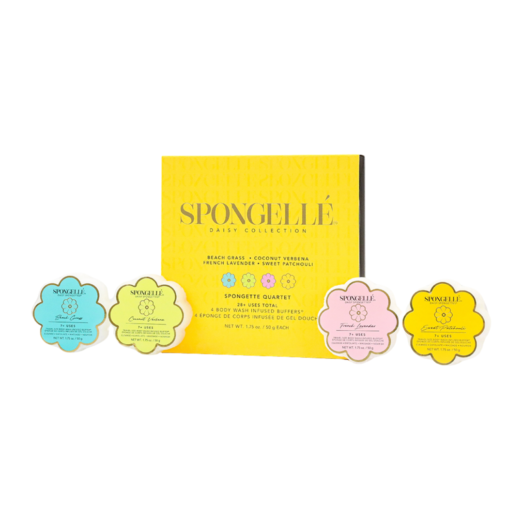 Transform your bath routine with Spongette Quartet Gift Set 2, a charming collection of daisy-shaped Body Wash Infused Buffers®. Perfect for a touch of everyday luxury, each Spongette offers a rich, long-lasting lather that will cleanse, exfoliate, moisturize, and nourish. Small and travel-friendly,