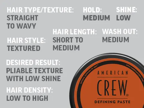 American Crew Defining Paste medium hold with low shine for added texture or increased definition.