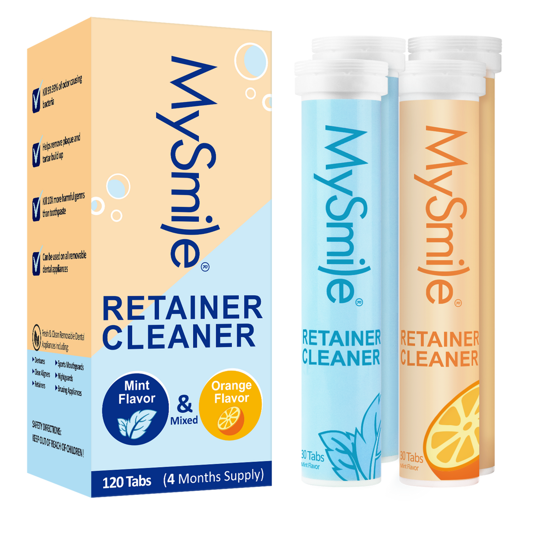 MySmile denture cleaner tablets kill 99.99% of odor-causing germs and stains. Safe for retainers, mouth guards, and more. Made with gentle, minty ingredients for daily freshness. Easy to use—just soak and rinse. Includes a 4-month supply for lasting care.