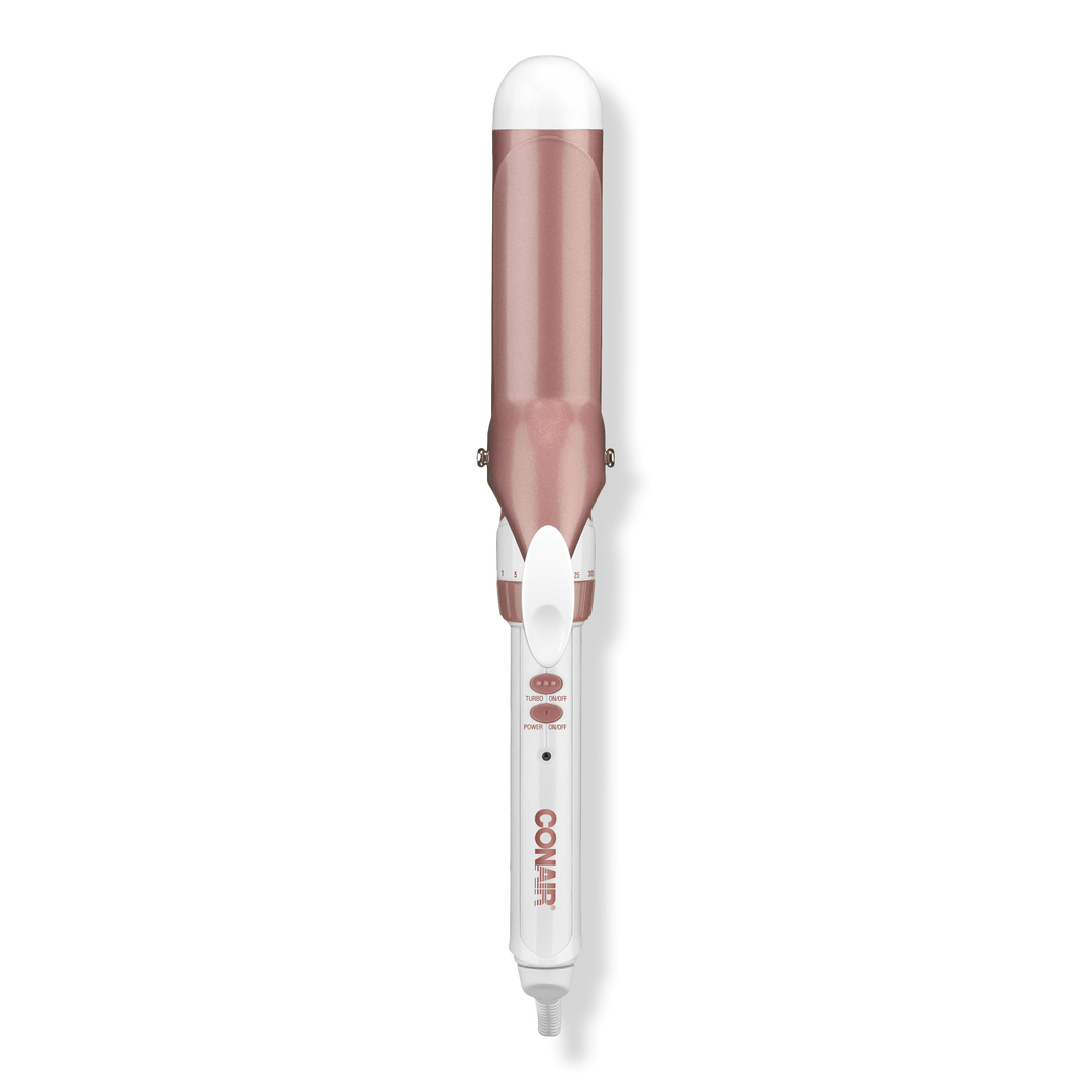 Smooth, long-lasting curls with less frizz using the Conair® Double Ceramic 1.5" Curling Iron. The double ceramic barrel provides even heat for long-lasting frizz-free styles. Includes 30 heat settings, reaching up to 400°F with Turbo Heat® for hard-to-style spots, cool tip, auto-off.