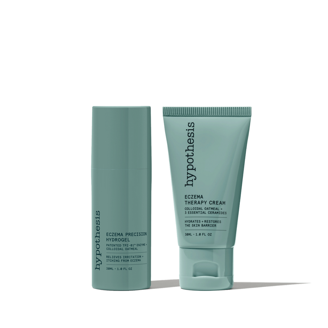 Hypothesis Eczema Precision Kit is a complete travel-sized eczema routine: Eczema Precision Hydrogel is formulated with the patented TPZ-01™ enzyme to kill eczema-associated Staph aureus bacteria & restore skin's balance, while Eczema Therapy Cream replenishes the skin barrier & locks in moisture.