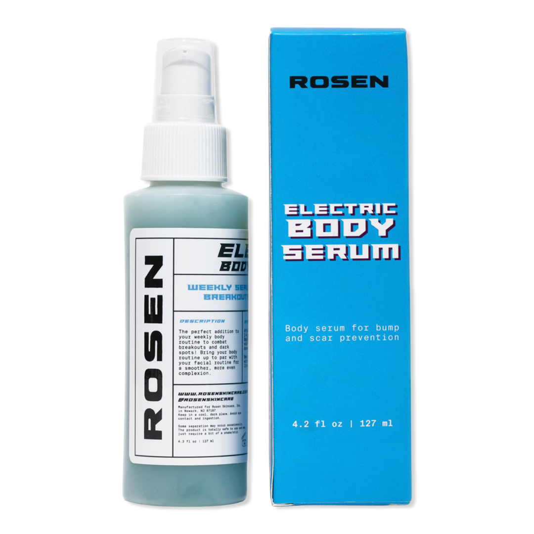 ROSEN Skincare's Electric Body Serum is the second step in the Body Routine to prevent breakouts and scars. Lactic Acid and White Willow Bark help smooth rough body skin and fade dark spots, while Apple Cider Vinegar and Eucalyptus fight active acne causing bacteria.