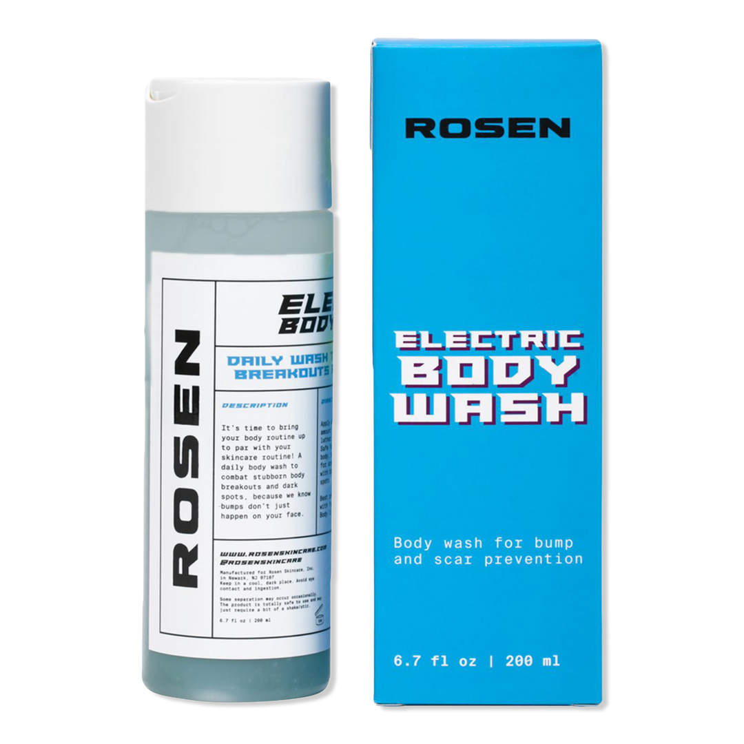 ROSEN Skincare's Electric Body Wash is the first step in the Body Routine to prevent breakouts and scars on your back, chest and everywhere-else. Lactic Acid exfoliates rough body skin to prevent bumps and fade dark spots, while Apple Cider Vinegar and Eucalyptus fight active acne causing bacteria.