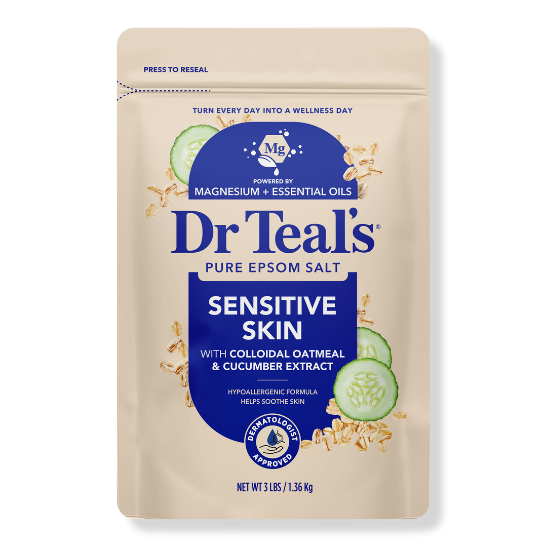 Dr Teal’s Sensitive Skin Epsom Salt Magnesium Soak gently soothes with Pure Epsom Salt, colloidal oatmeal, and cucumber extract. This lightly fragranced, hypoallergenic formula helps calm skin and ease tired muscles for a relaxing bath.