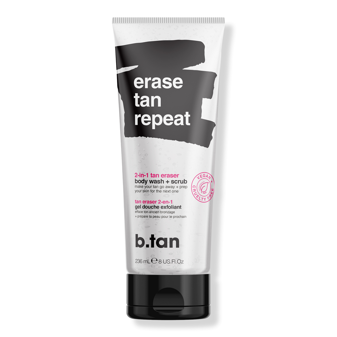 b.Tan is your pre + post tanning prep savior! Erase Tan Repeat 2-in-1 Body Wash + Scrub oh so light scrub gently lifts dead skin cells (and your old tan!). Conditions skin + leaves it perfectly prepped for your next dark bronzed glow.
