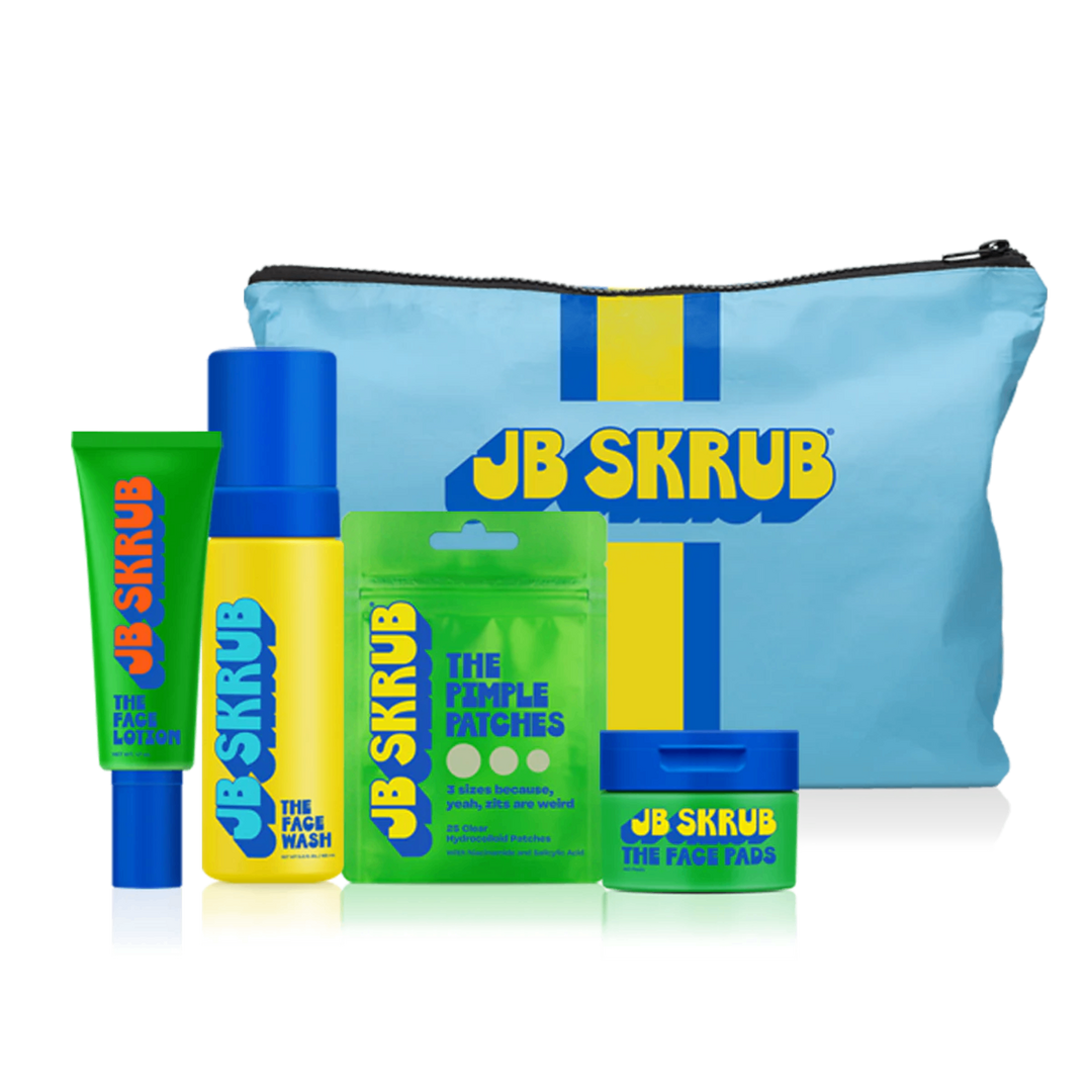 Perfect for Easter Baskets, Camp & Gifting! JB SKRUB's Skin Care Essentials Set - the complete 4-step skin care routine for boys, girls, teens and tweens. This dermatologist-approved bundle includes everything needed to cleanse, treat, hydrate, and target breakouts PLUS a free travel pouch .