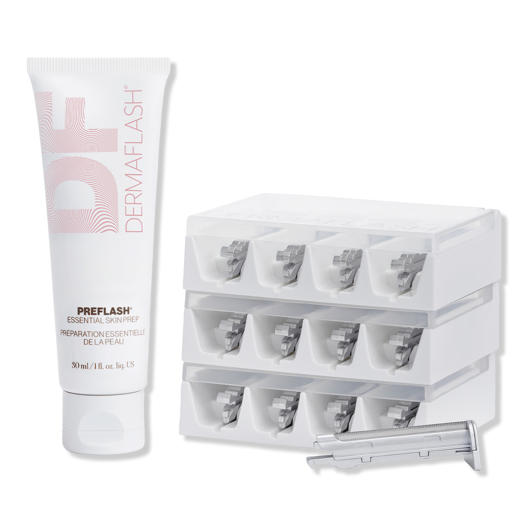 DERMAFLASH The Essentials Sonic Dermaplaning Refill Kit delivers a superior sonic dermaplaning experience with ultimate precision and closer contact with skin, plus an upgraded safety cage for maximum protection from nicks and cuts.