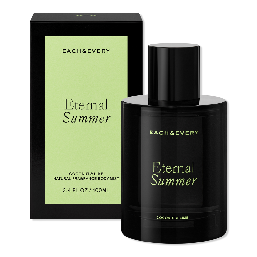 Each and Every Eternal Summer Coconut and Lime Natural Fragrance Body & Hair Mist. Fine fragrance ingredients in a luxurious glass bottle, formulated as a mist for daily luxury. Your passport to hammock naps and late-night dips.