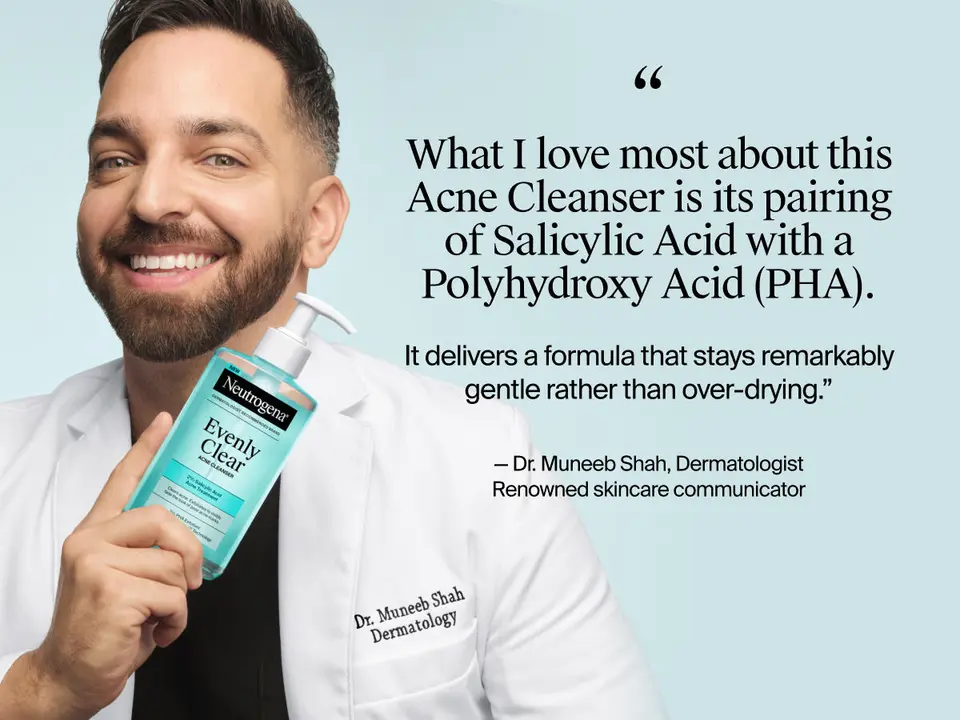 Clinically proven Neutrogena Evenly Clear Acne Cleanser with 2% salicylic acid & 2% PHA exfoliant clears breakouts, removes 85% of excess oil in 1 wash & visibly fades look of post-acne marks for clear, smooth, even skin.