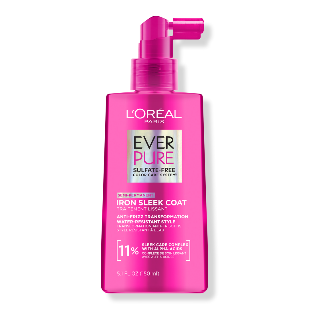 - L'Oreal Paris EverPure Sulfate Free Iron Sleek Coat provides humidity and frizz resistance up to 24 hours plus color protection.