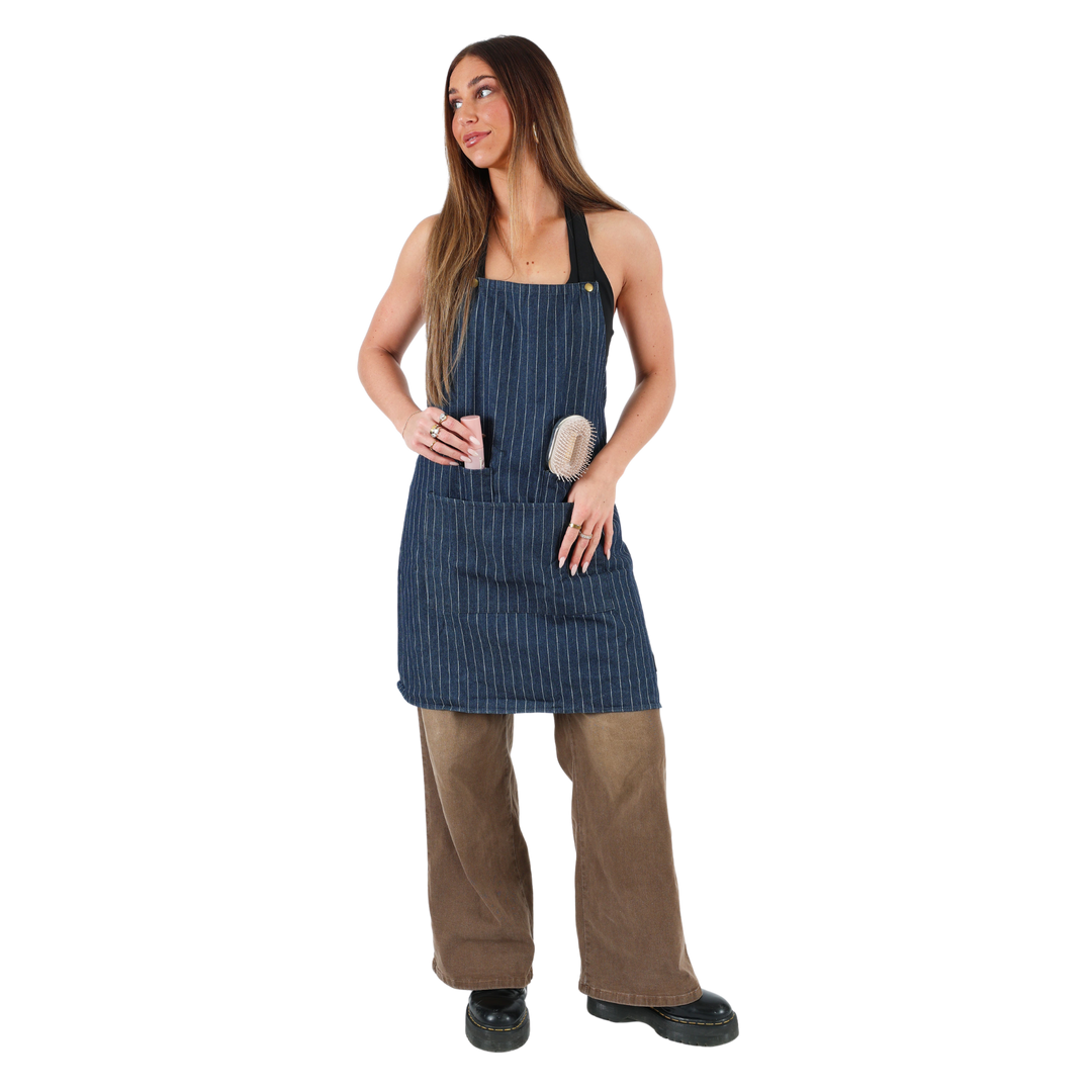 - A modern, everyday apron made from navy organic denim with classic pinstripes. Designed with an adjustable neck strap and extra-long ties for an easy, comfortable fit. Durable, stain-resistant, and low-maintenance, this one-size-fits-all apron is perfect for salons, chefs, artists, and anyone working hands-on all day.