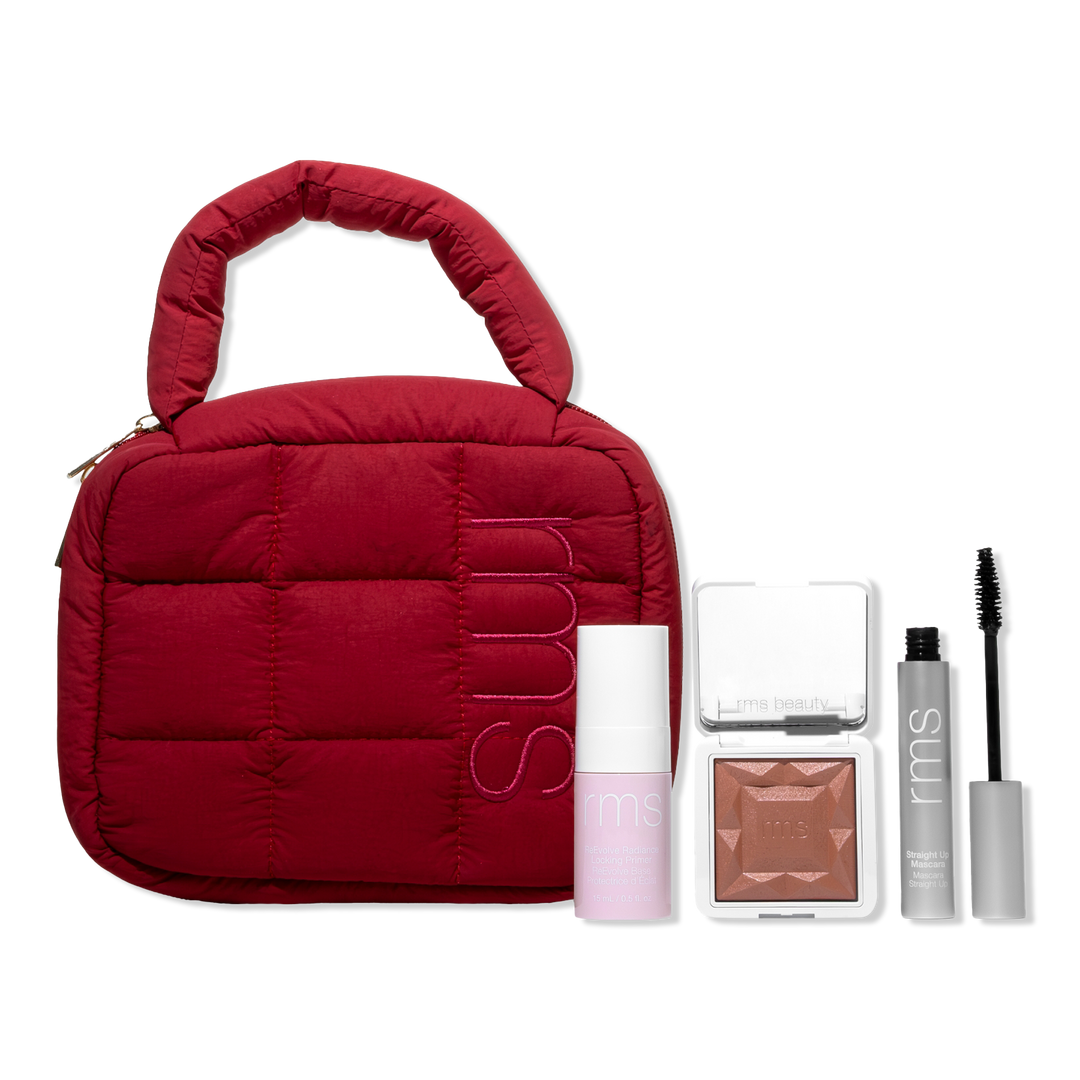 RMS Beauty's The Everyday Icons Set features a travel-size ReEvolve Radiance Locking Primer, Crystal Slipper Blush & Straight Up Mascara in a limited-edition red bag.