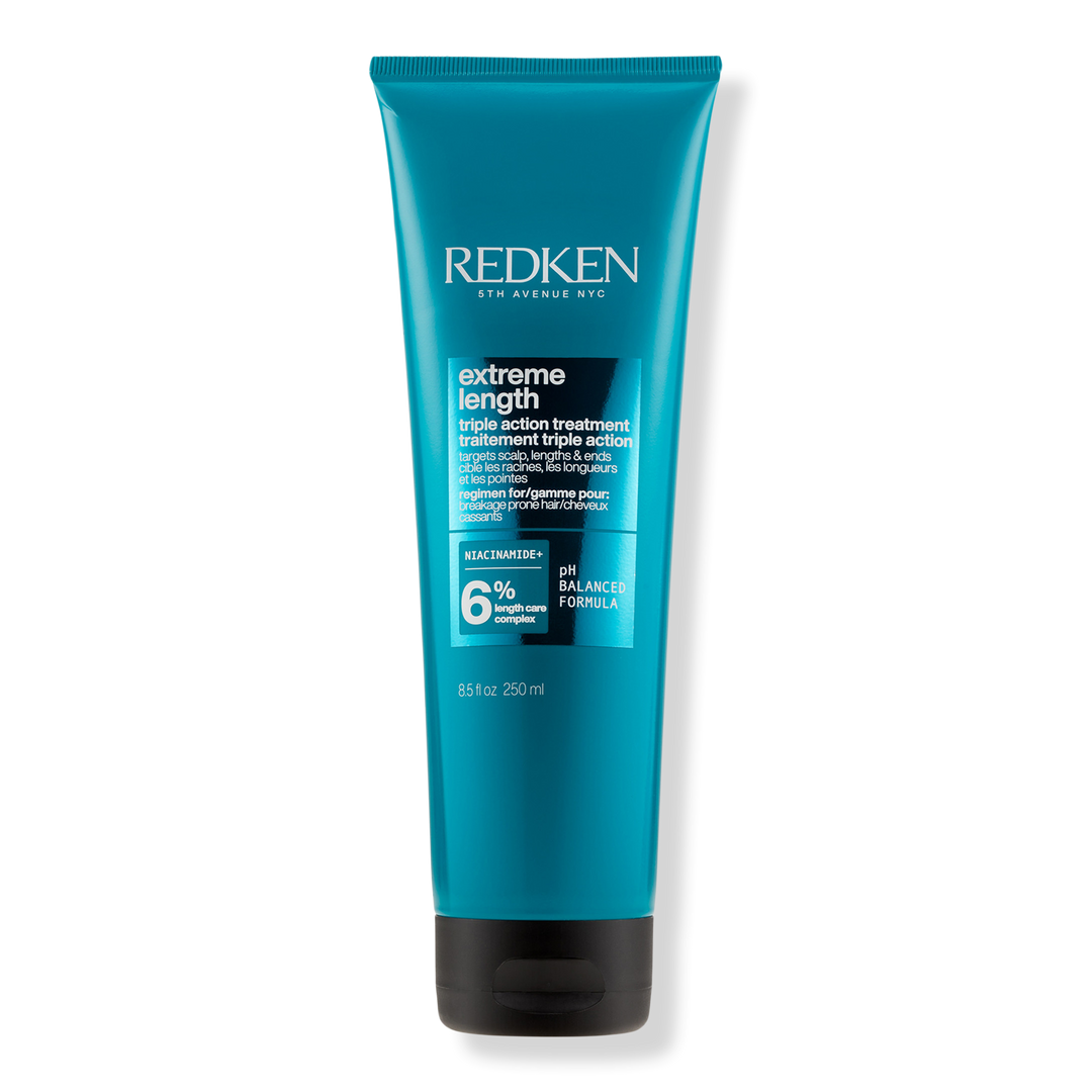 Redken Extreme Length Triple Action Treatment Mask is a 5-minute treatment mask formulated with biotin, niacinamide, and castor oil to promote a healthy-feeling, nourished scalp, strengthened lengths and visibly reduced split ends for longer, stronger hair.