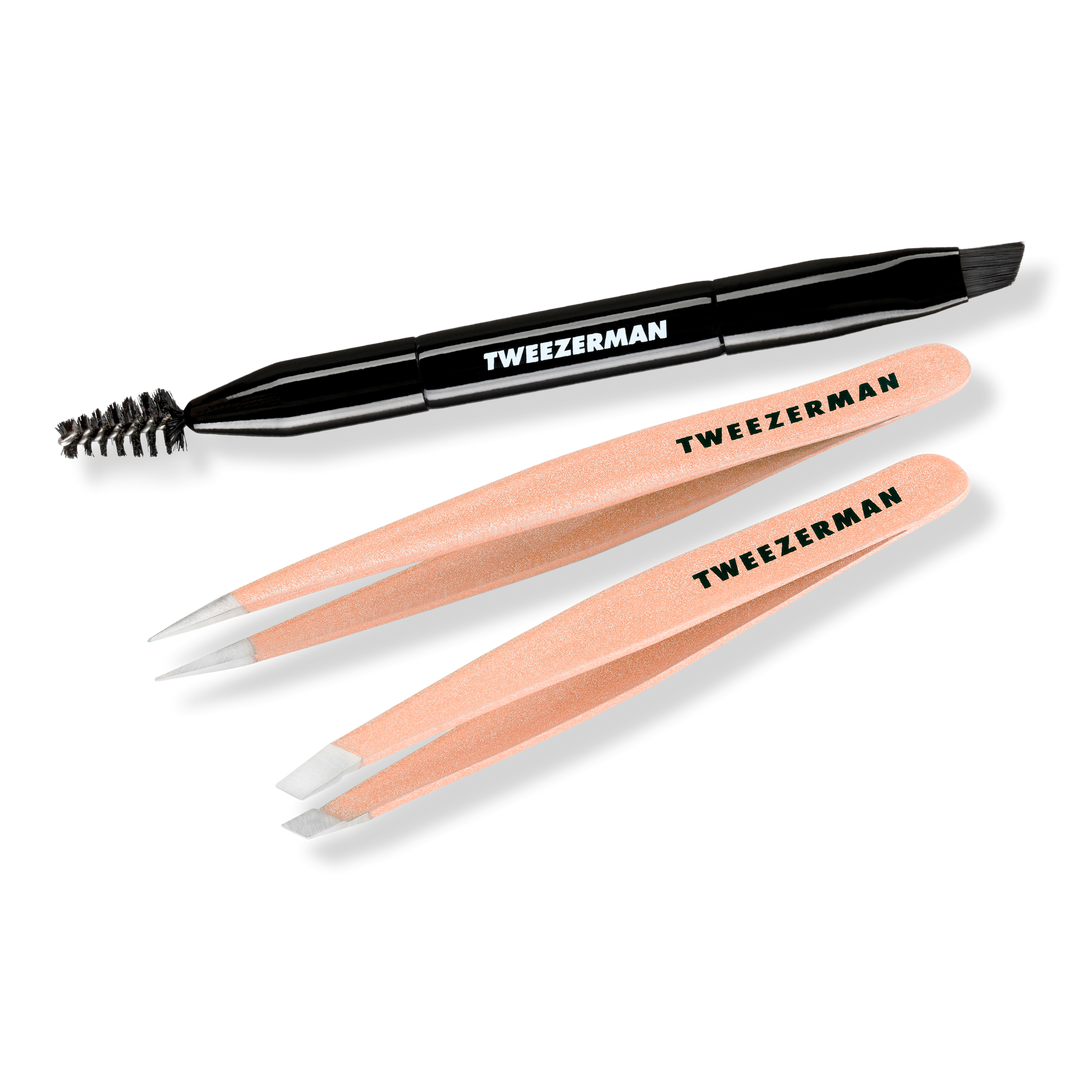 Tweezerman's Eyebrow Shaping Set features premium quality, precision tools for expert brow shaping. Perfectly aligned petite sized versions of their Slant and Point Tweezers paired with a Mini Angled Brow Brush. All the essentials to expertly shape and define brows.