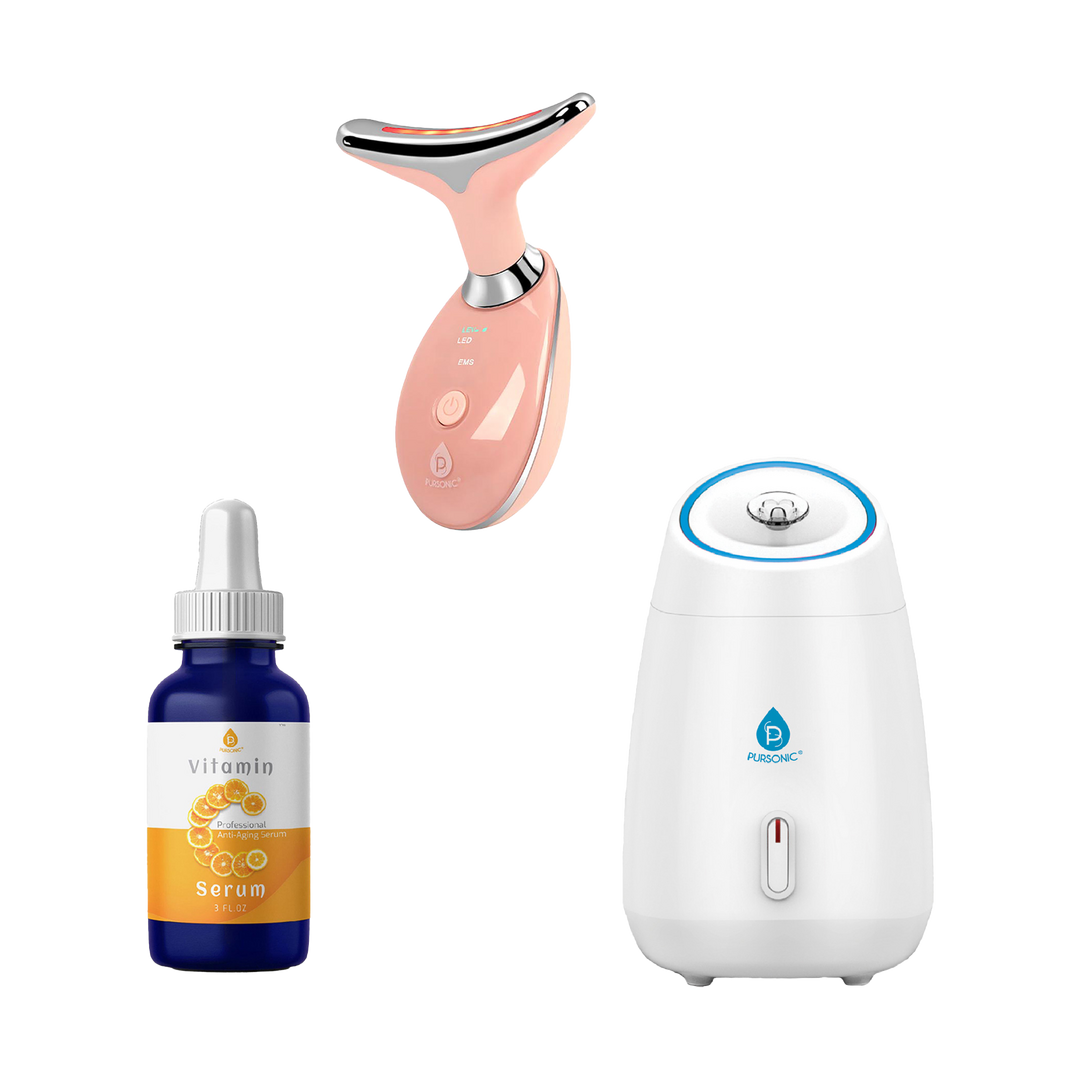 - Pursonic Vitamin C 20% Serum: Finish your routine with a powerhouse serum that brightens, firms, and protects. Packed with 20% Vitamin C, this potent formula reduces dark spots, shrinks pores, improves elasticity, and defends against free radicals for a youthful, glowing complexion.