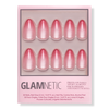 Remove any previously applied nail polish. Wash and dry hands. Gently push back cuticles using the cuticle stick and sanitize nails with alcohol pads. Size Glamnetic nails by placing on finger and select sizes best suited for your natural nails. Apply an even layer of glue to natural nails and the back of Glamnetic nails. Align Glamnetic nails with cuticle line and apply at a downward angle. Press down firmly and hold for 10-20 seconds. Apply all 10 nails and if needed, file or clip to achieve desired shape.