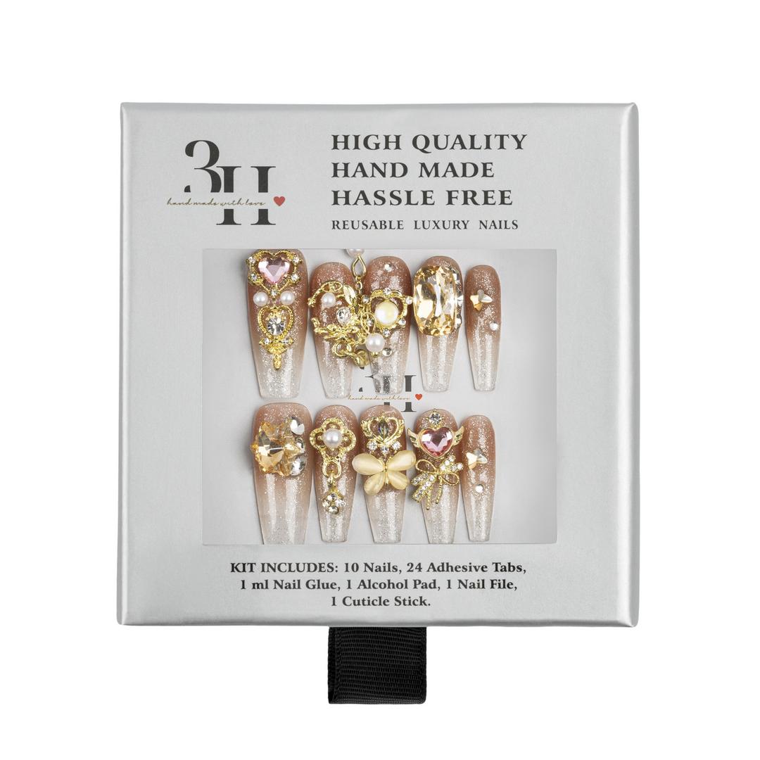Shimmering ombré nails with 3D gold charms, pearls, butterflies, and heart details. A bold yet dreamy design crafted from high-quality materials. Handmade and reusable for an elevated look.