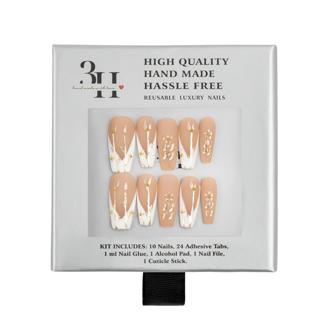 A modern French tip look with gold leafy 3D accents. These high-quality, reusable press-on nails in a sleek coffin shape offer a luxurious finish that works for everyday or elevated occasions.