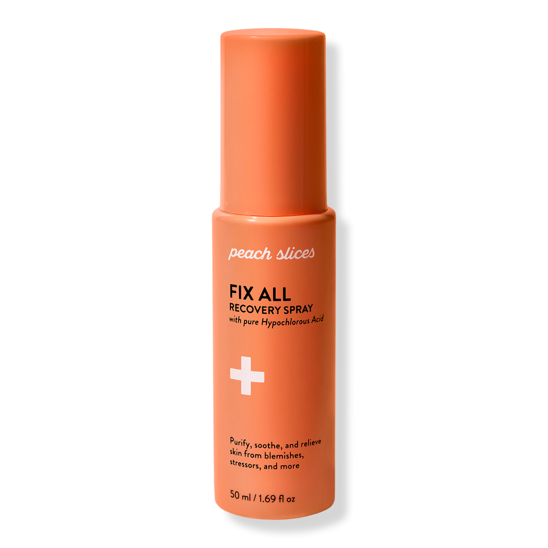 Peach Slices Fix All Recovery Spray is a universal solution with antibacterial properties for redness, inflammation, and nearly every skin stressor. Pure, pH-stable hypochlorous acid in electrolyzed water visibly cleanses, purifies, and soothes without stripping or drying. Spritz anytime, anywhere.