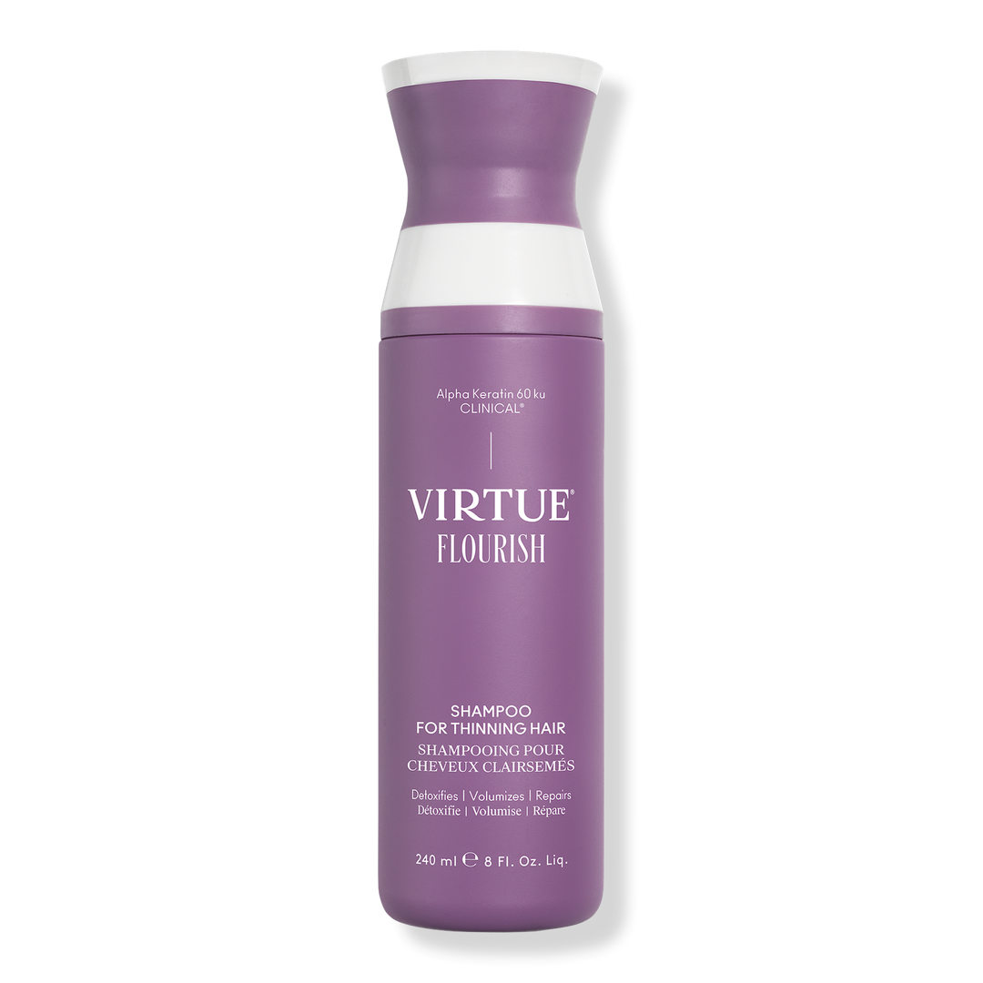 Virtue Flourish Shampoo for Thinning Hair delicately removes scalp buildup, cleanses the hair shaft, and clears debris from follicle openings, creating an environment for healthy growth.