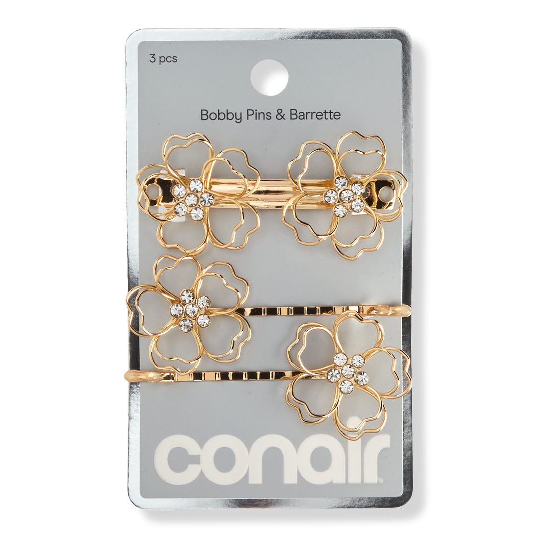 Add a polished, feminine detail to pulled-back styles and updos with the Conair Flower Pin and Barrette Set. This coordinated set includes one barrette and two bobby pins with decorative floral filigree.