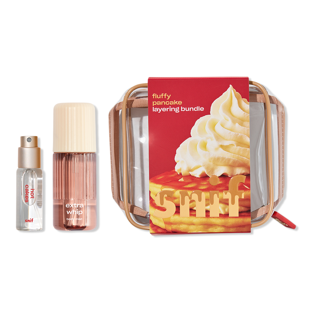 Snif Fluffy Pancake Layering Bundle comes in a toiletry bag with mini sizes of the nostalgic Hot Cakes fragrance and creamy Extra Whip body mist. Stack the chilled vanilla mist on top of the syrupy pancake fragrance for ultimate goodness.