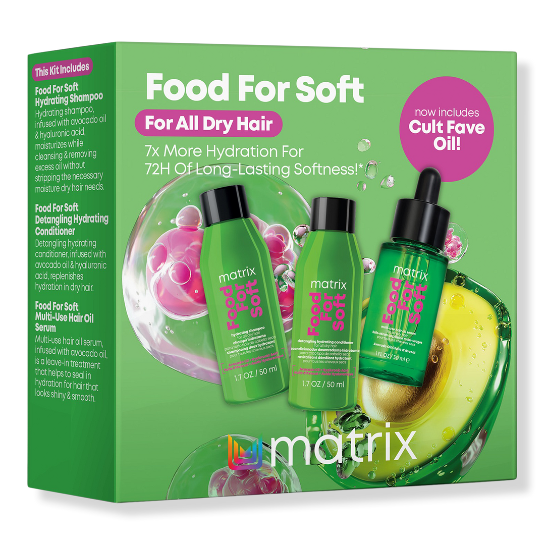 The Matrix Food For Soft Trial Kit transforms dry, brittle hair with a hydrating shampoo, conditioner, and multi-use oil serum. Infused with avocado oil and hyaluronic acid, this professional formula provides 7x more moisture for up to 72 hours*, leaving hair soft, shiny, and smooth.