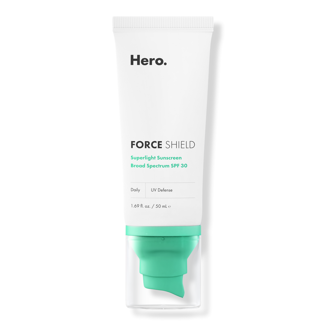 Meet your dream sunscreen for acne-prone skin. Hero Cosmetic Force Shield Superlight Sunscreen Broad Spectrum SPF 30 is an ultra-breathable mineral SPF 30 that checks every box: airy-light, shine-free, and weightless. Summer days never felt so good.