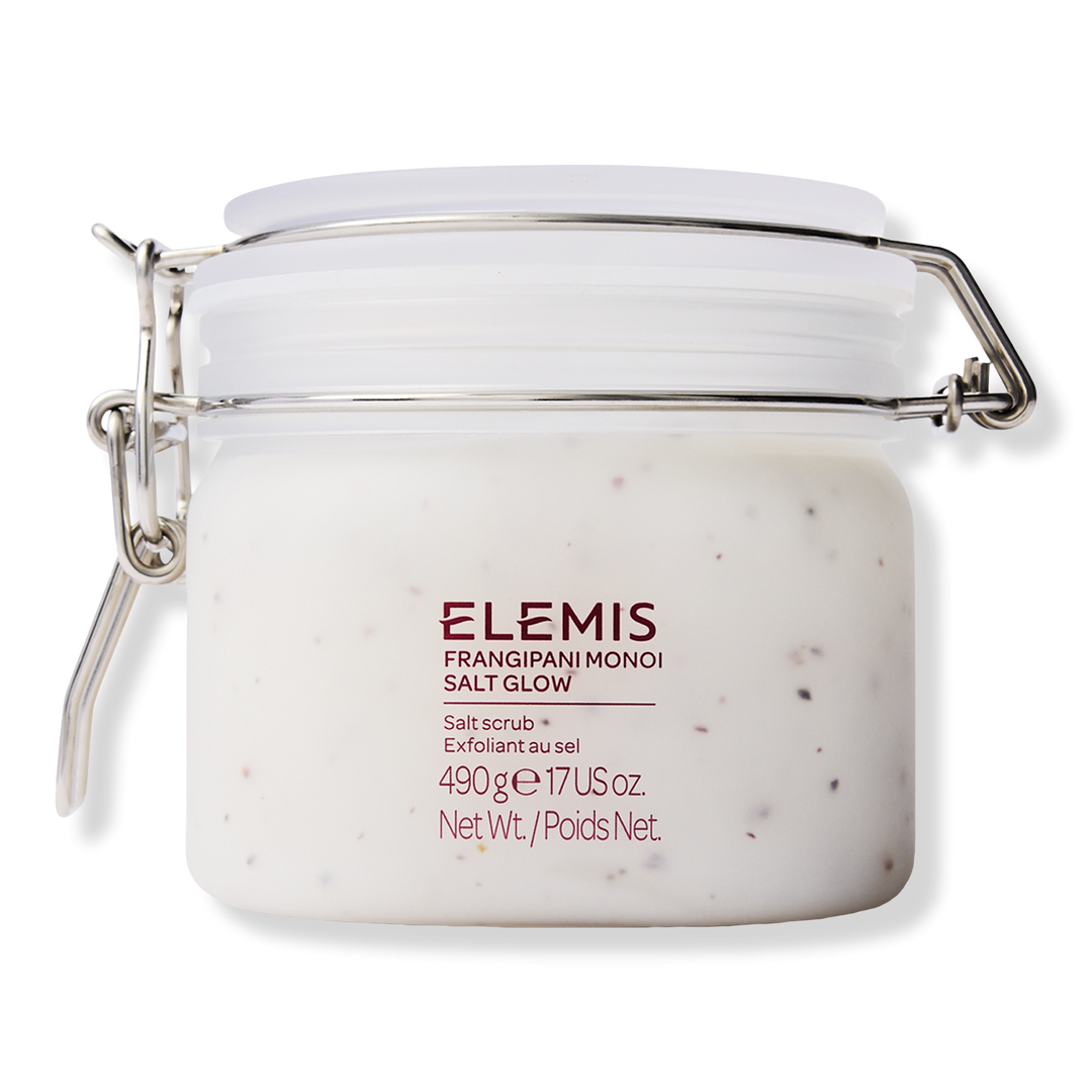 ELEMIS Frangipani Monoi Salt Glow Body Scrub gently exfoliates and softens the skin while sealing in moisture for silky, radiant, and beautifully scented skin.
