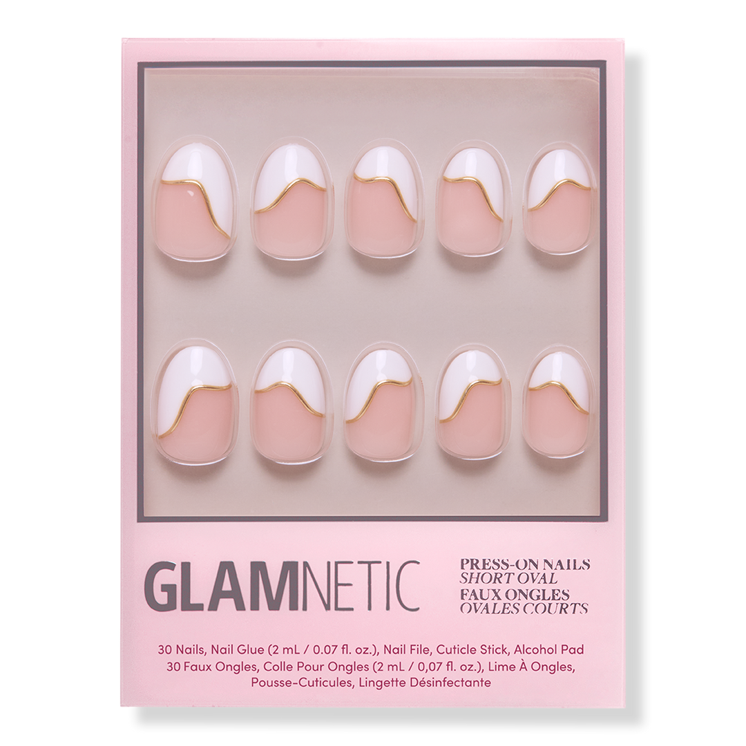 A très romantic take on the French mani, Glamnetic’s French Muse Press-On Nail Set features abstract white tips, accented with glossy gold foil. Finished with a sleek, high-shine gloss, this short oval set gives you a durable, salon-quality mani in 10 minutes.
