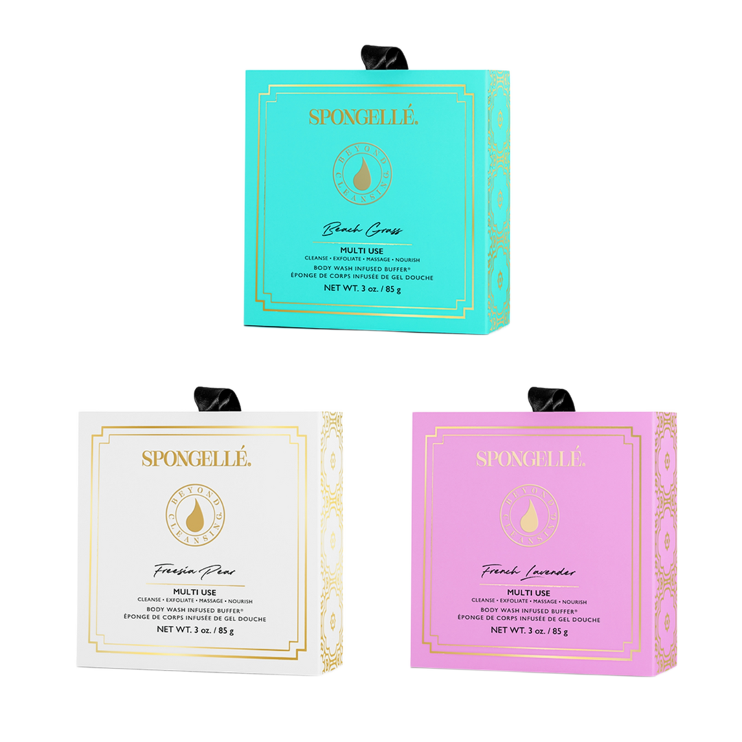 Elevate your bath with Spongellé’s® Fresh Boxed Flower Set. Enjoy bestselling Body Wash Infused Buffers® in Beach Grass, French Lavender & Freesia Pear—beautifully boxed and originally $57. Smells like aquatic sea notes kissed by sun. Feels like golden light dancing on waves.
